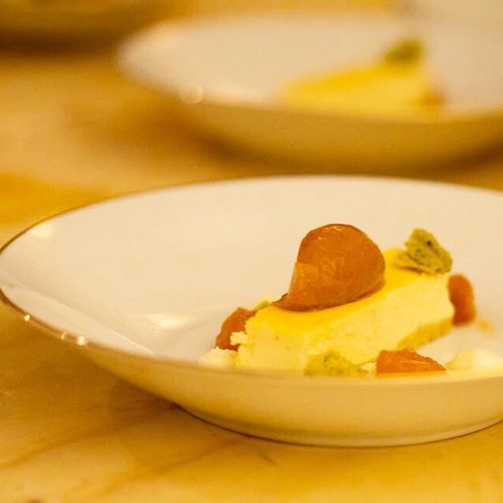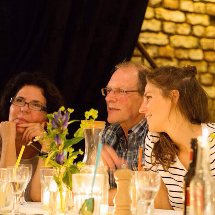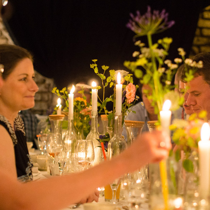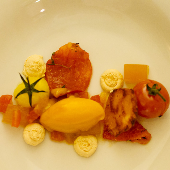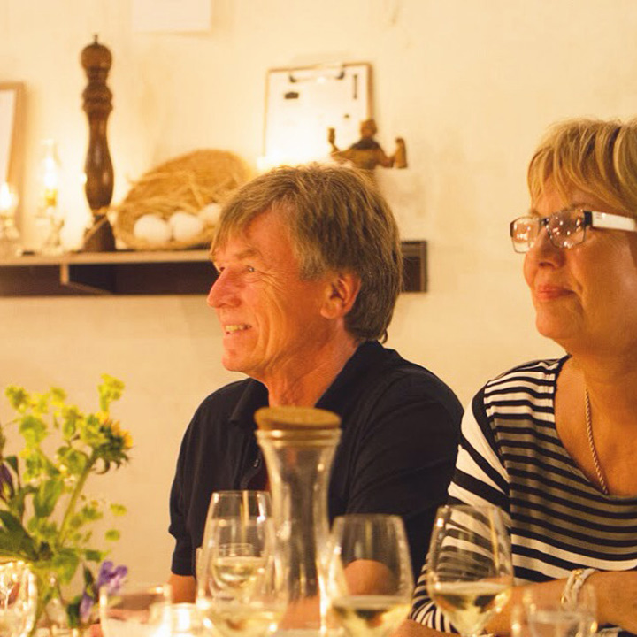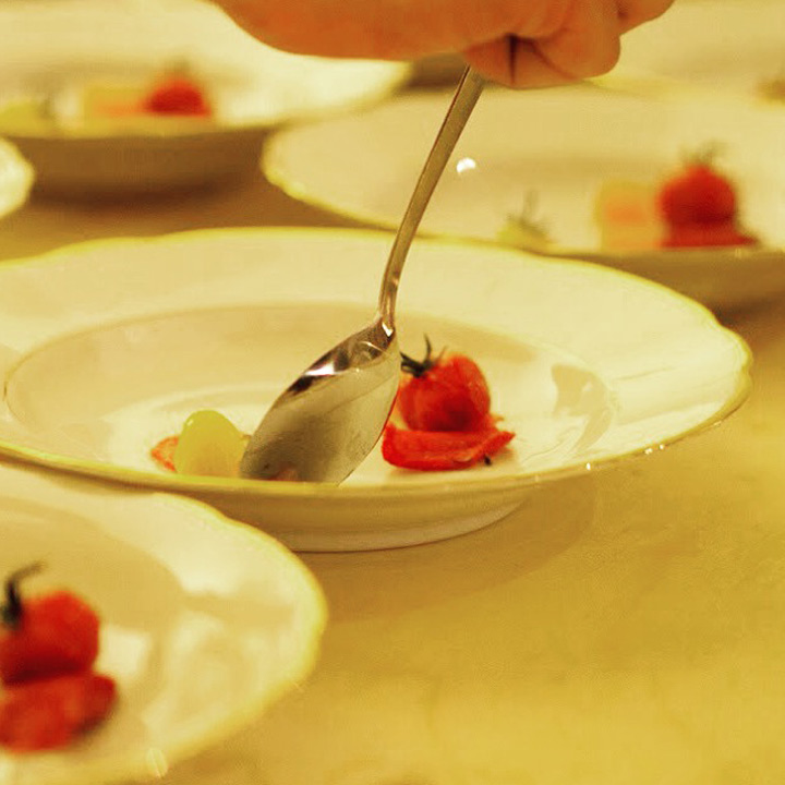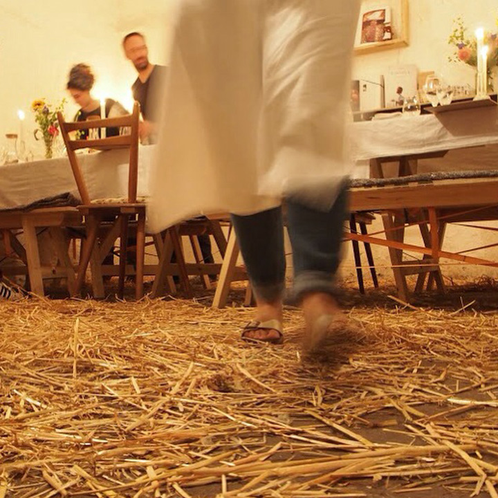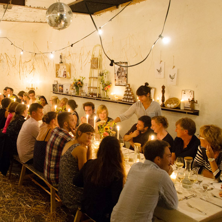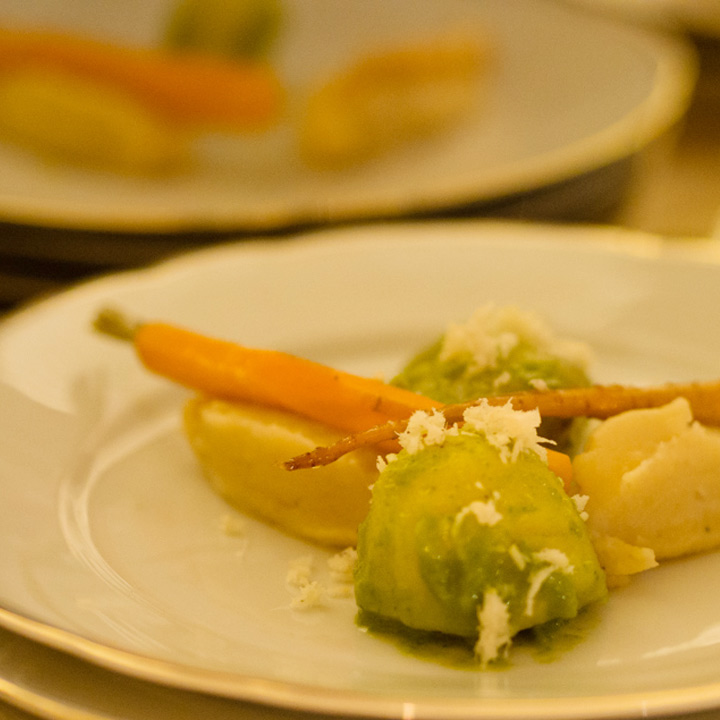 Diesmal stand die festliche Tafel mitten im Stroh, denn wir wollten den Raum ein einen Hühnerstall verwandeln. Leicht zu erahnen, was auf der Speisekarte stand: Gockel. Mit der Vorspeise aus Tomaten zeigte unser Koch Eiko Scharfenberger gleich mal warum er mit einem Michelinstern ausgezeichnet wurde: warmer Tomatengelee, Tomatenmousse, getrocknete Tomaten, Tomatensorbet, Tomatenconcassee und confierte Kirschtomaten mit einem Parmesanchip – zu was eine Tomate so alles werden kann! Weiter ging es mit dem Gockel, der zusammen mit schwarzen Oliven und Salbei geschmort wurde und wie bei Oma in Schüsseln auf den Tisch kam. Als Beilage gab es eine Petersilienwurzelmousseline, mit Vanille glacierte Möhrchen, Spinatkartoffeln und frisch geriebenen Kren… sehr sehr lecker. Zur frisch aufgebrühten „Nippeser Melange“ gab es dann eine Käsekuchenschnitte mit Topfencreme, Aprikosensorbet und einen gebackenen Schwamm aus Zitronenmelisse. Der Applaus der Gäste war Eiko sicher! Unserer sowieso!