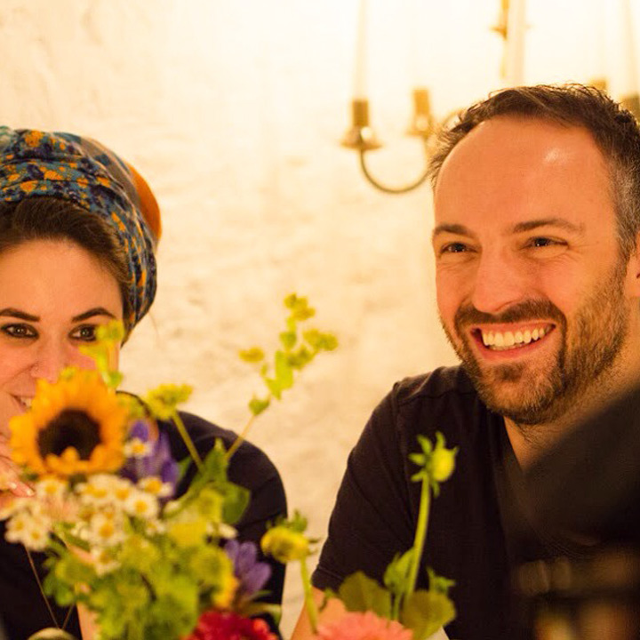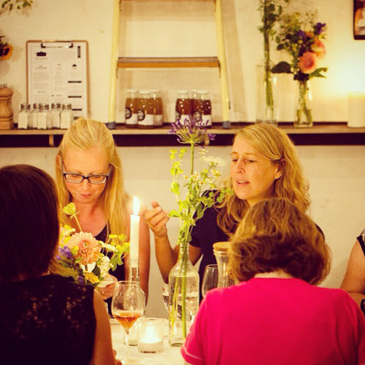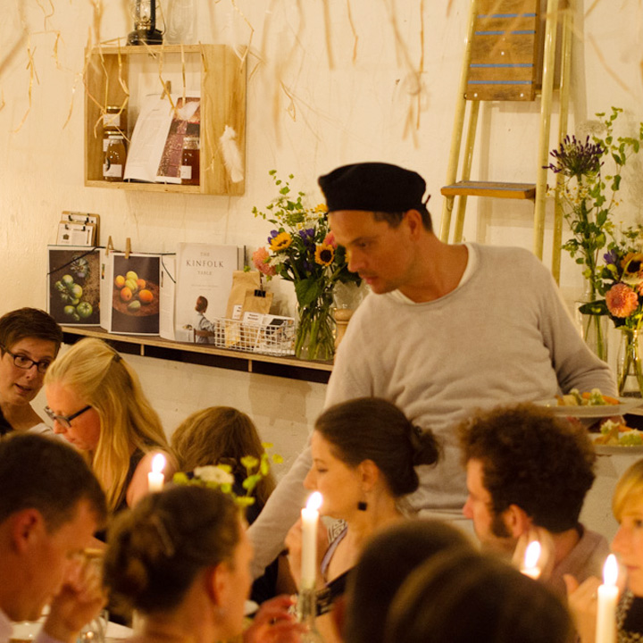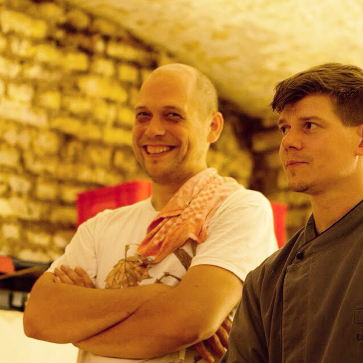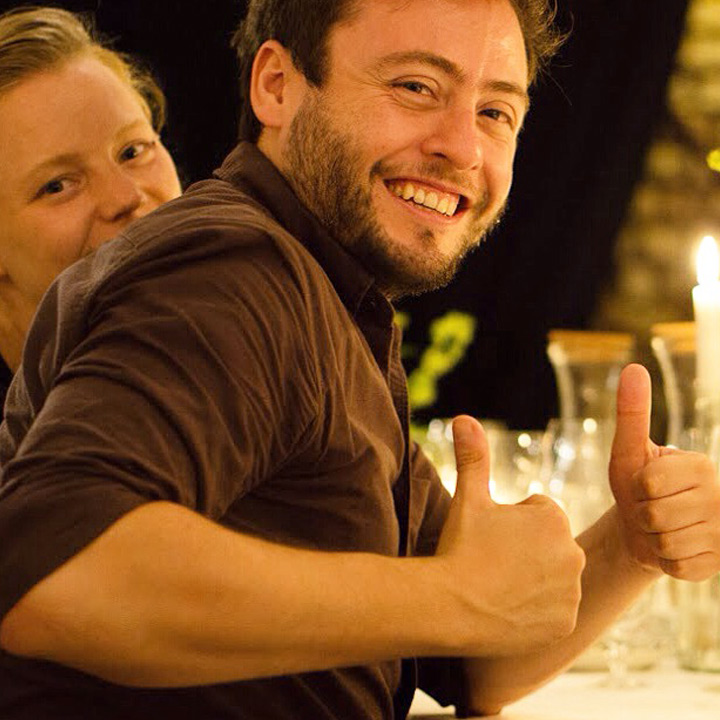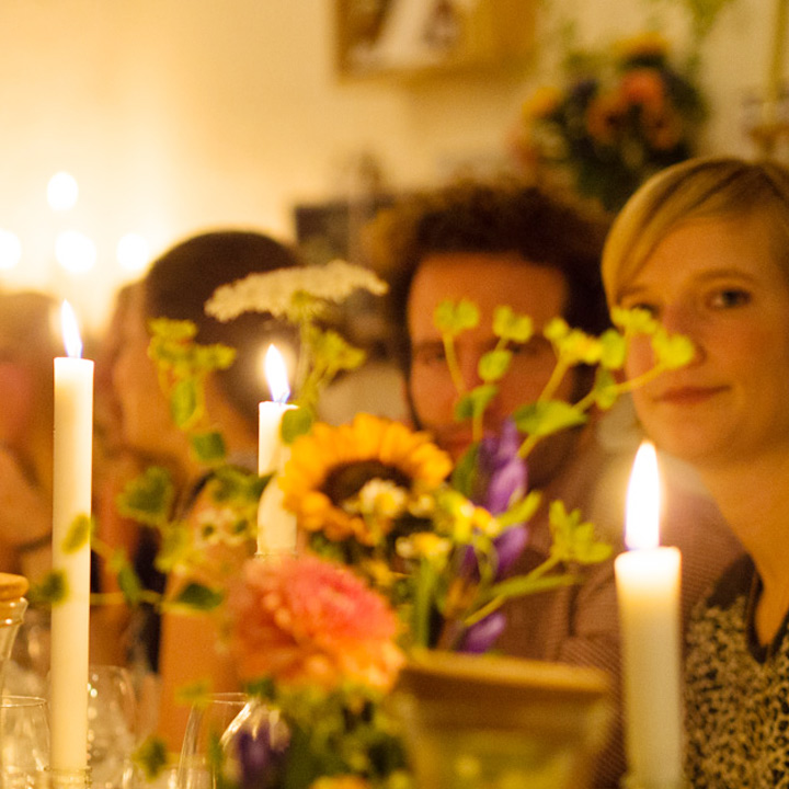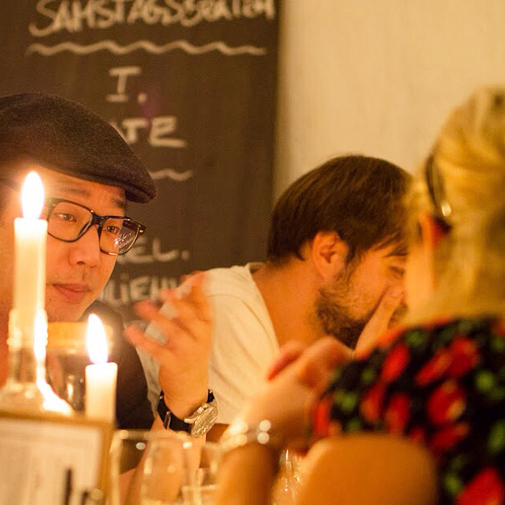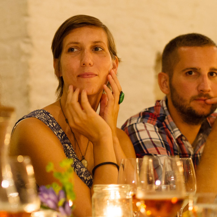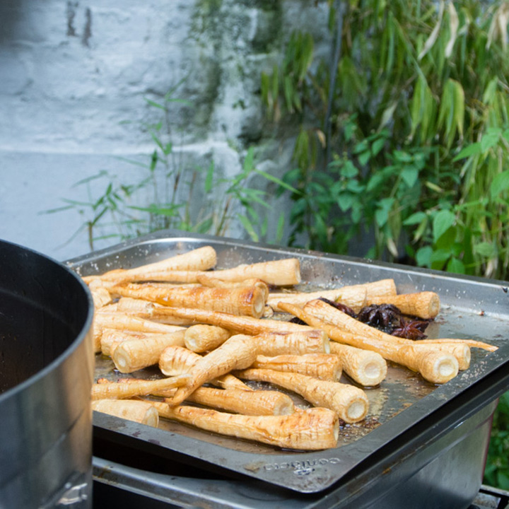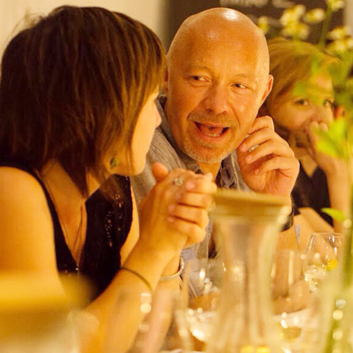 Diesmal stand die festliche Tafel mitten im Stroh, denn wir wollten den Raum ein einen Hühnerstall verwandeln. Leicht zu erahnen, was auf der Speisekarte stand: Gockel. Mit der Vorspeise aus Tomaten zeigte unser Koch Eiko Scharfenberger gleich mal warum er mit einem Michelinstern ausgezeichnet wurde: warmer Tomatengelee, Tomatenmousse, getrocknete Tomaten, Tomatensorbet, Tomatenconcassee und confierte Kirschtomaten mit einem Parmesanchip – zu was eine Tomate so alles werden kann! Weiter ging es mit dem Gockel, der zusammen mit schwarzen Oliven und Salbei geschmort wurde und wie bei Oma in Schüsseln auf den Tisch kam. Als Beilage gab es eine Petersilienwurzelmousseline, mit Vanille glacierte Möhrchen, Spinatkartoffeln und frisch geriebenen Kren… sehr sehr lecker. Zur frisch aufgebrühten „Nippeser Melange“ gab es dann eine Käsekuchenschnitte mit Topfencreme, Aprikosensorbet und einen gebackenen Schwamm aus Zitronenmelisse. Der Applaus der Gäste war Eiko sicher! Unserer sowieso!