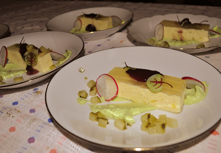 Zur Vorspeise gab es eine Kartoffelterrine mit Schnittlauchsauce und Gurkenrelisch.