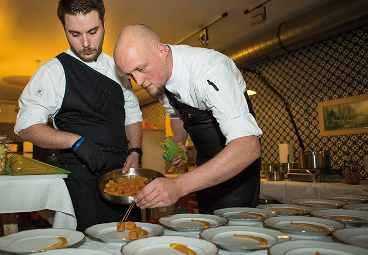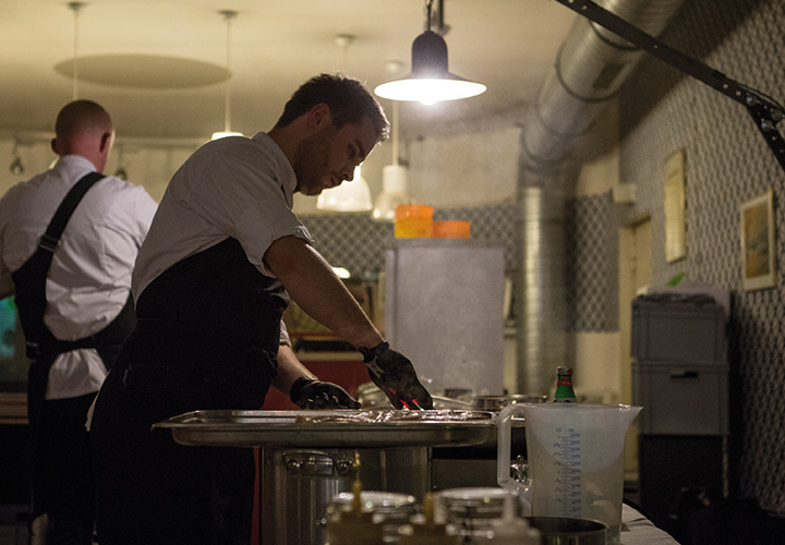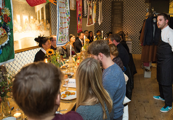 Weil es so schön war, sind wir nocheinmal in den Waschsalon zurückgekehrt für einen ganz besonderen Supper Club. Diesmal hatten wir die neuen Köche des gerade eröffneten Johann Schäfer Brauhaus zu Gast: Julian Karst und Sven Kloppenburg! Die beiden haben uns ein tolles, saisonales Menü auf die Teller gezaubert! Los ging es mit „Rheinischem Kürbis“ in all seinen Facetten… egal ob süss sauer eingelegt oder als warmer Muffin, diese Variation vom Kürbis war einfach der Hammer. Im Hauptgang dann das Kaninchen. Manch einer ist bei Kaninchen ja erstmal etwas vorsichtig, aber es ist einfach ein tolles Fleisch und Sven und Julian haben einen tollen Hauptgang für uns zusammengestellt, bei dem wirklich das ganze Tier verwertet wurde. So gab es das sous-vide gegarte Filet, eine feine Leberwurst aus den Innereien und dazu confierten Sellerie, eine Staudenselleriecreme, glasierten Staudensellerie und leckere Kartoffel-Serviettenknödel!Zum Schluss das Dessert: Pochierte Gewürzbirne mit Mandeleis, Crumbel & Salz-Karamell… Für uns ein rundum perfektes Menü! Wir freuen uns schon jetzt auf unseren ersten Besuch bei den beiden im Johann Schäfer Brauhaus! Dort wird es viele kleine leckere Gerichte geben. Eine gutbürgerliche Brauhausküche, die mit der Rafinesse der beiden Köche neu interpretiert wird! Wir wünschen euch ganz viel Spaß und Erfolg… natürlich hoffen wir aber auch, dass ihr die Zeit findet mal wieder für uns zu kochen ; )