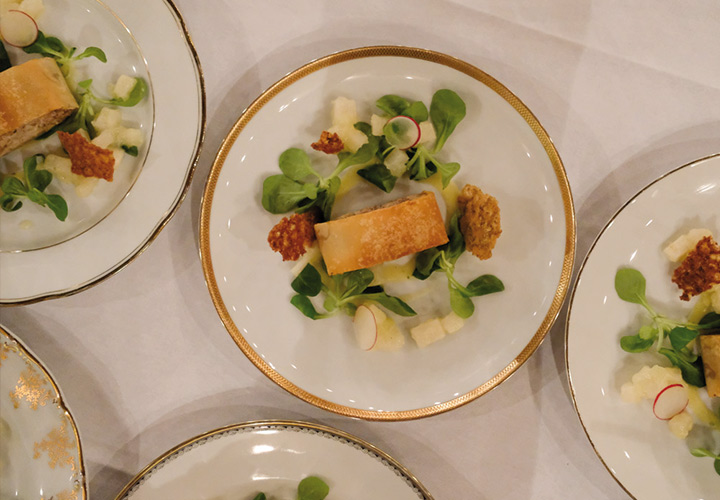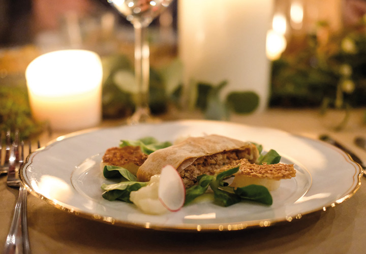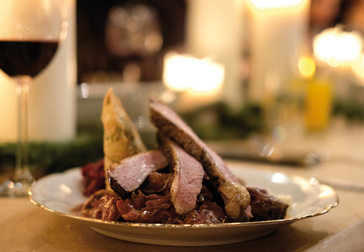 Den Beginn machte Feldsalat mit Kartoffel-Sherry-Dressing, dazu süß-saure Butterrübe und ein Ziegenkäsetrudel mit Apfel und Walnuss. Im Hauptgang dann die Ente – die ganze Ente: rosa Entenbrust, geschmorte und einmal gebratene Keule. Dazu Serviettenknödel, Rotkohl und Birnen – Apfel Ragout. Das war mal ein Teller… nach einer kleinen Pause ging es dann weiter mit Spekulatius-Gries-Knödel, Zwetschgenröster und einem kleinen Schokoladenküchlein.