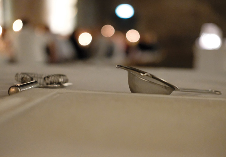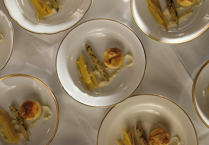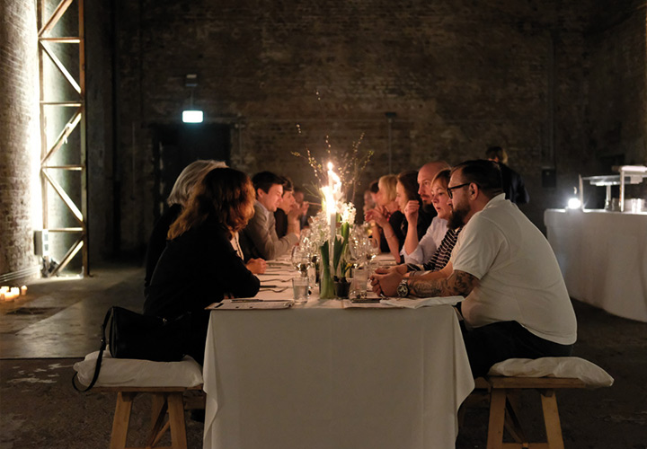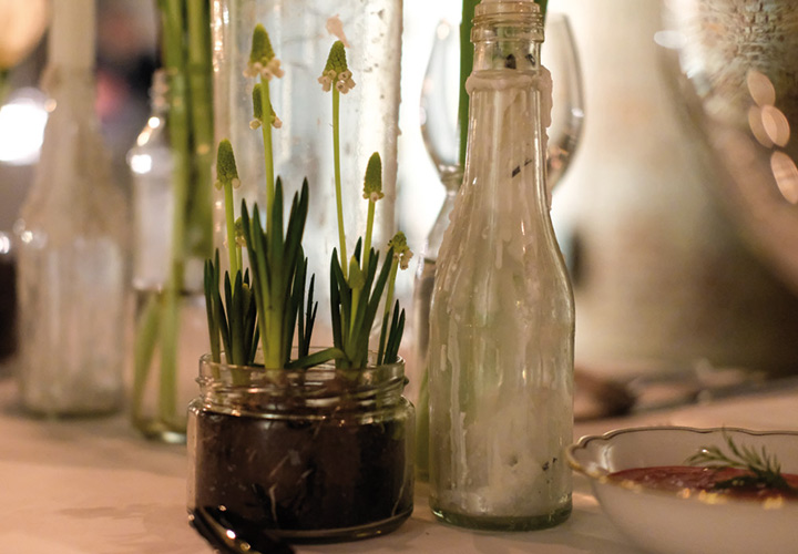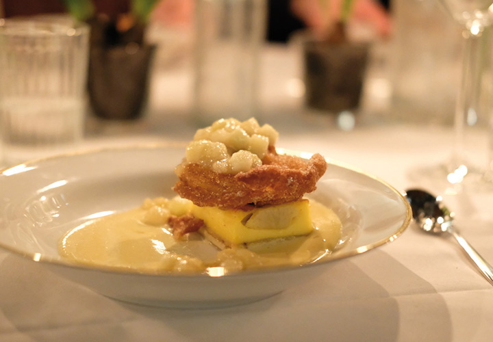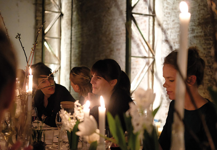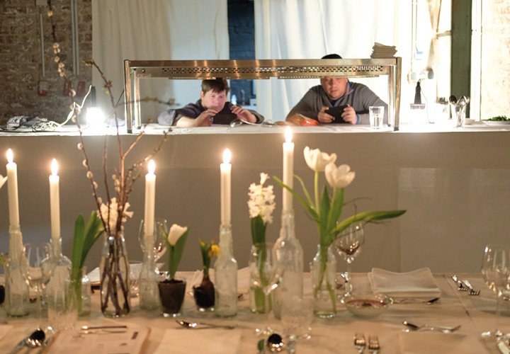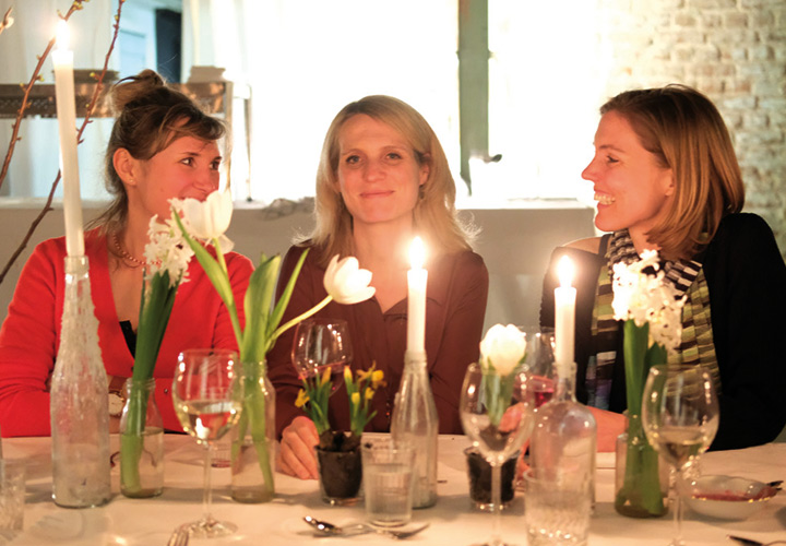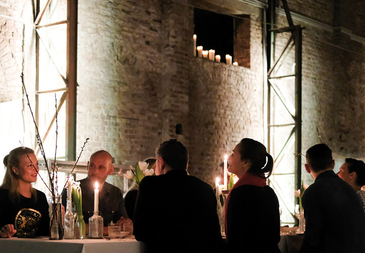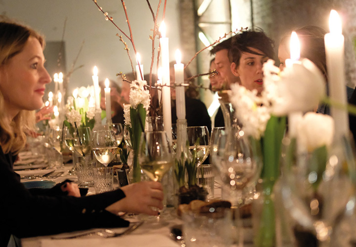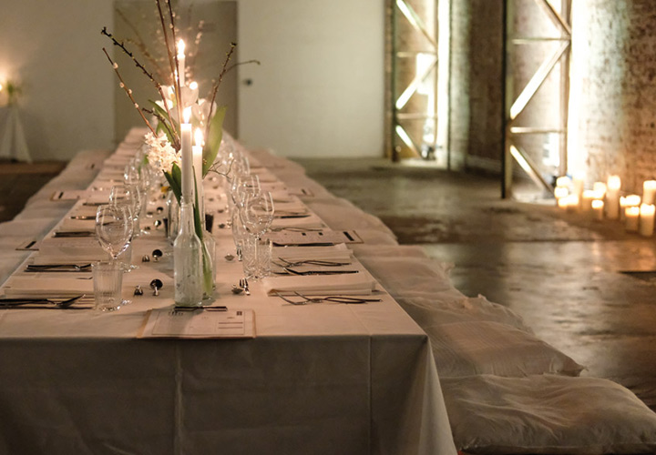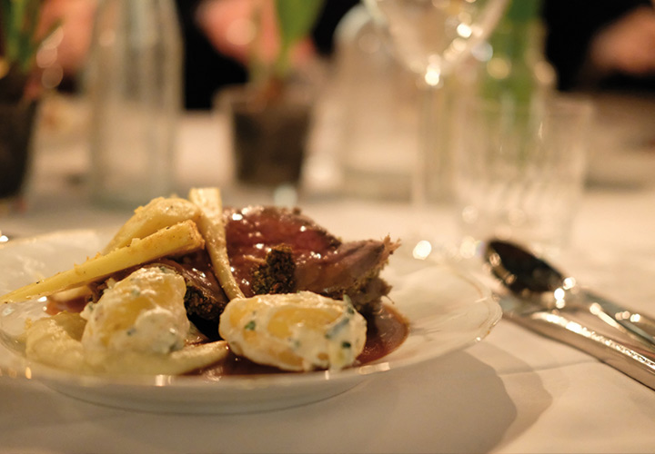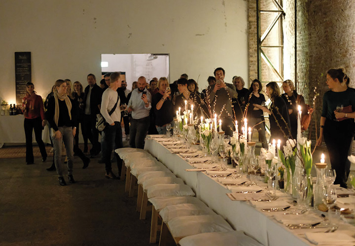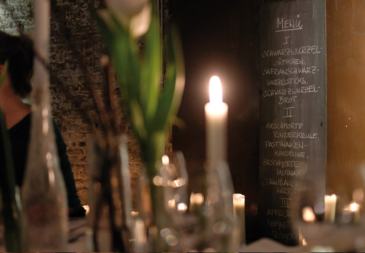 Nach den Weihnachtsfeiern im Dezember sind wir im Februar nochmal in die alte Industriehalle in Ehrenfeld eingezogen und haben die ersten Frühlingsboten mitgebracht… zumindest auf den Tischen sind die ersten Tulpen und Zweige erblüht, auf den Tellern bleiben wir wohl noch ein bissl bei Wurzelgemüse und eingelagerten Knollen. Aber was Gemüse, wie z.B. die Schwarzwurzel so alles kann bzw. wie gut und unterschiedlich sie schmecken kann, hat uns Eiko an diesem Abend mal wieder bewiesen. Seine Vorspeise bestand nämlich nur aus eben diesem Gemüse! Auf dem Teller servierte er uns ein Schwarzwurzelbrot, ein Schwarzwurzelpüree, mit Kräutern geschmorte Schwarzwurzel und mit Safran marinierte Schwarzwurzel. Das ganze wurde dann mit einer Kelle Schwarzwurzelsuppe aufgegossen. Sehr sehr lecker! Im Hauptgang dann zwei weitere Knollen: Pastinake, ebenfalls als feine Mousseline und im ganzen geschmort, dazu Rinderkeule mit einer schmackhaften dunklen Jus, als zweiote Knolle dann Kartoffeln in einem Meerrettichrahm. Zum Abschluss dann die Äpfel von Familie Sass, versteckt in einem Beignet, einer Apfeltarte, dazu Sabayone und Apfelragout. Ein tolles Menü… Vielen lieben Dank an Eiko!!!!!